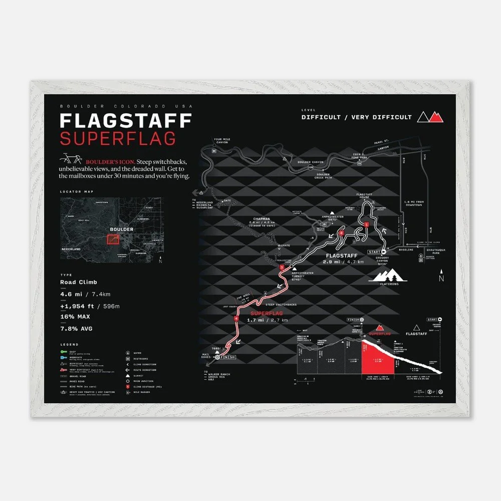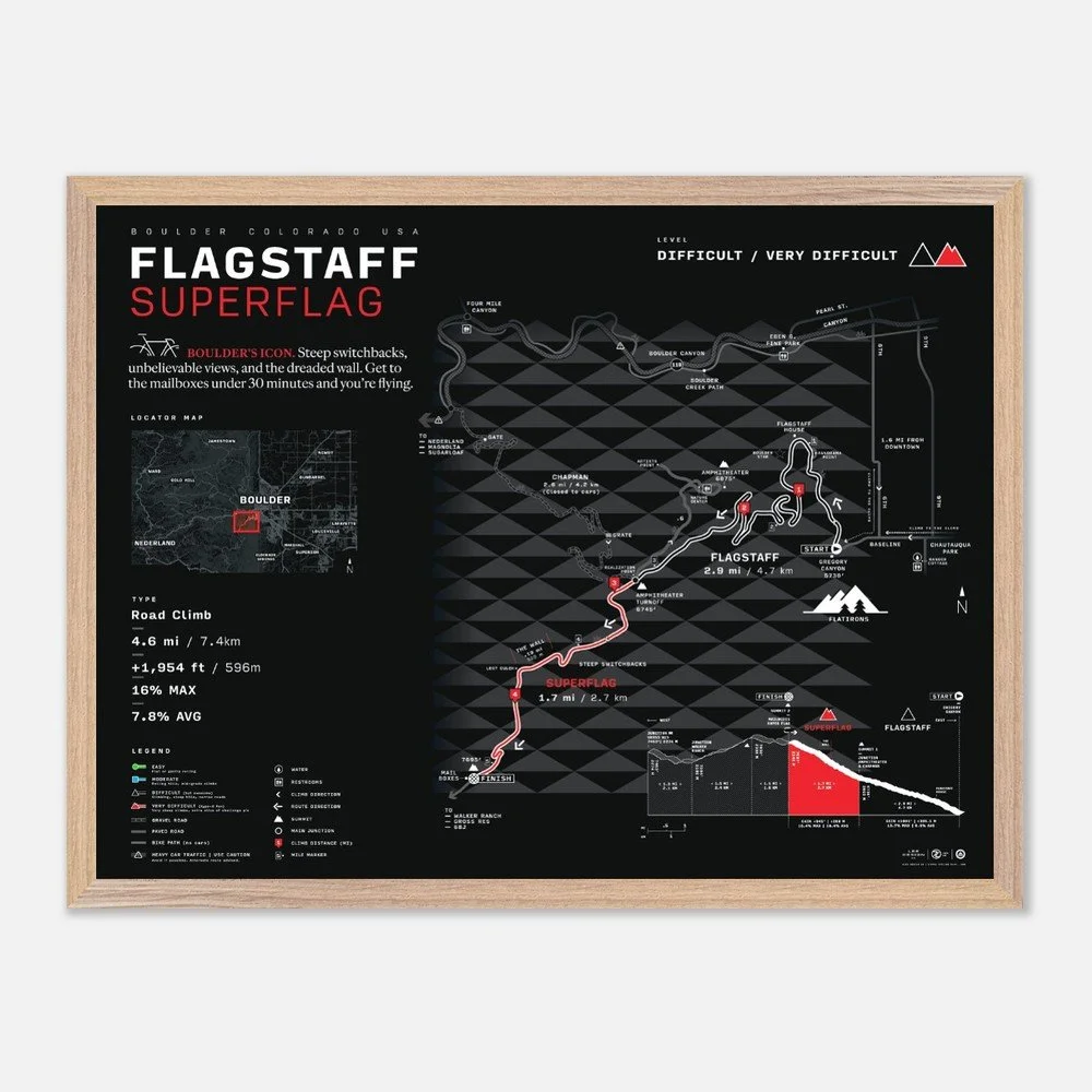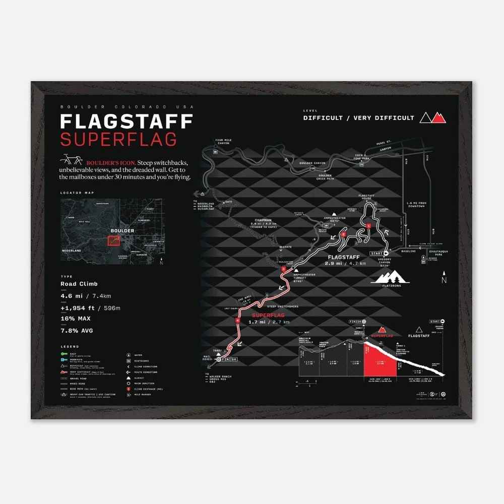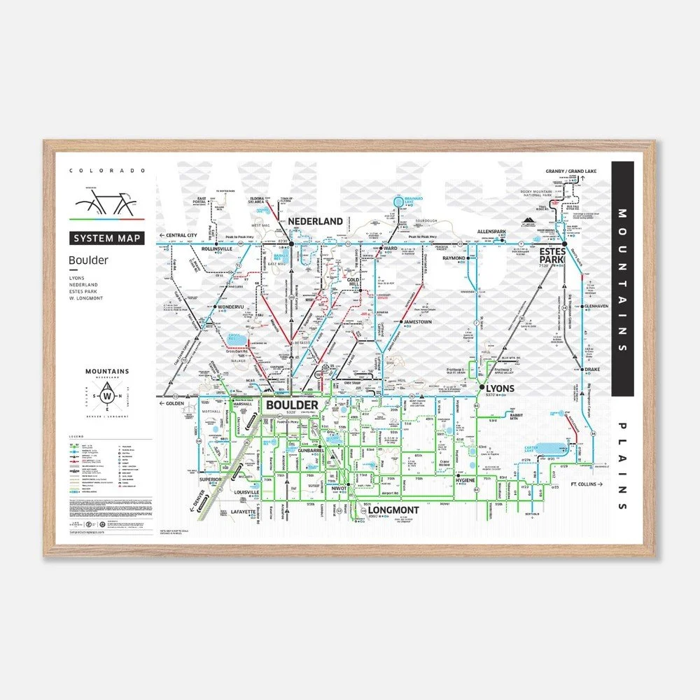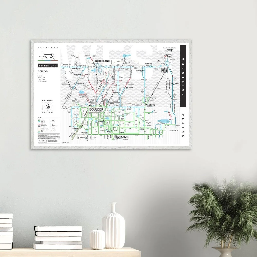 Our newly updated Boulder City Map features a west-up orientation to reflect the true pull of the mountains. Designed with a bold, minimalist style, it highlights popular road and gravel routes, cut-throughs, key climbs, and essential stops—from Flagstaff and Lee Hill to the Boulder Reservoir and beyond.