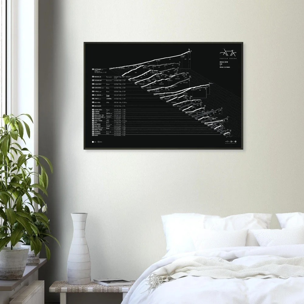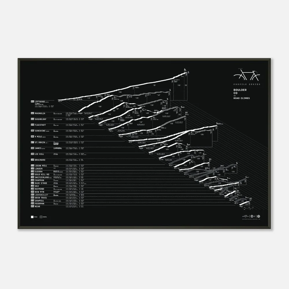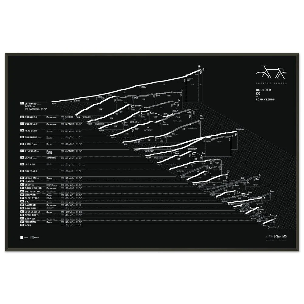 From short, sharp climbs like Chapman to epic routes like Lefthand Canyon, this design stacks 25 of Boulder’s most iconic road ascents in one clean, comparative view. It’s equal parts art and insight—perfect for cyclists who love to nerd out over stats or daydream their next ride.