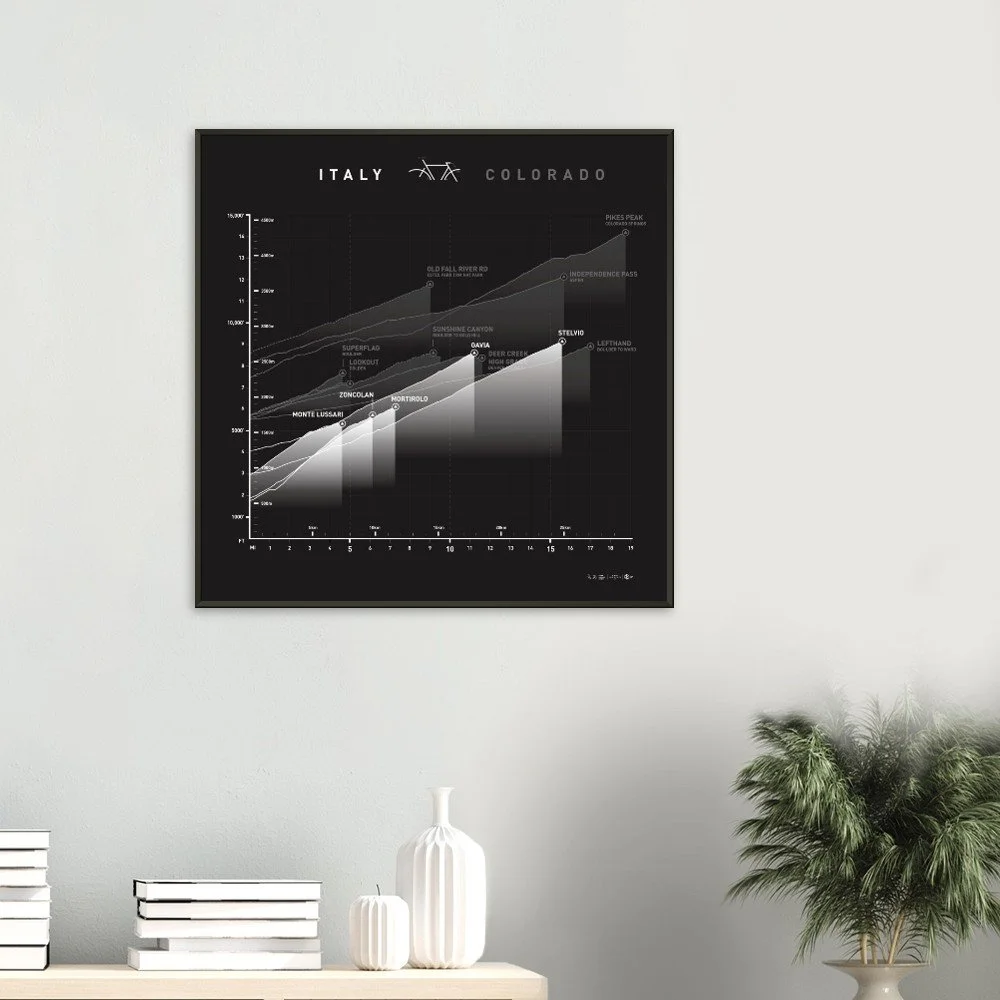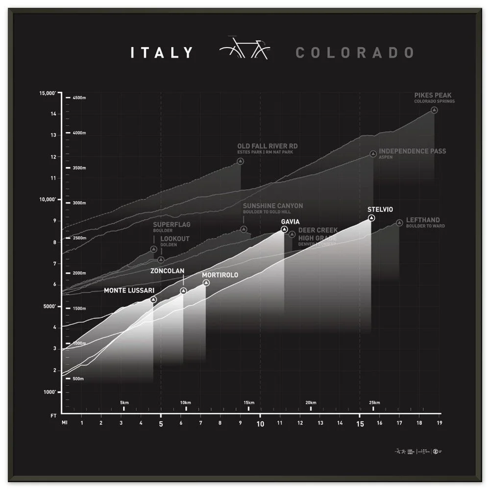 Italy serves drama with every pedal stroke—and now you can compare its legendary ascents to Colorado’s alpine giants. From the iconic Stelvio to the notorious Zoncolan, this poster pits them against climbs like Sunshine Canyon and Lefthand for a visual showdown that’s equal parts beauty and suffering.
